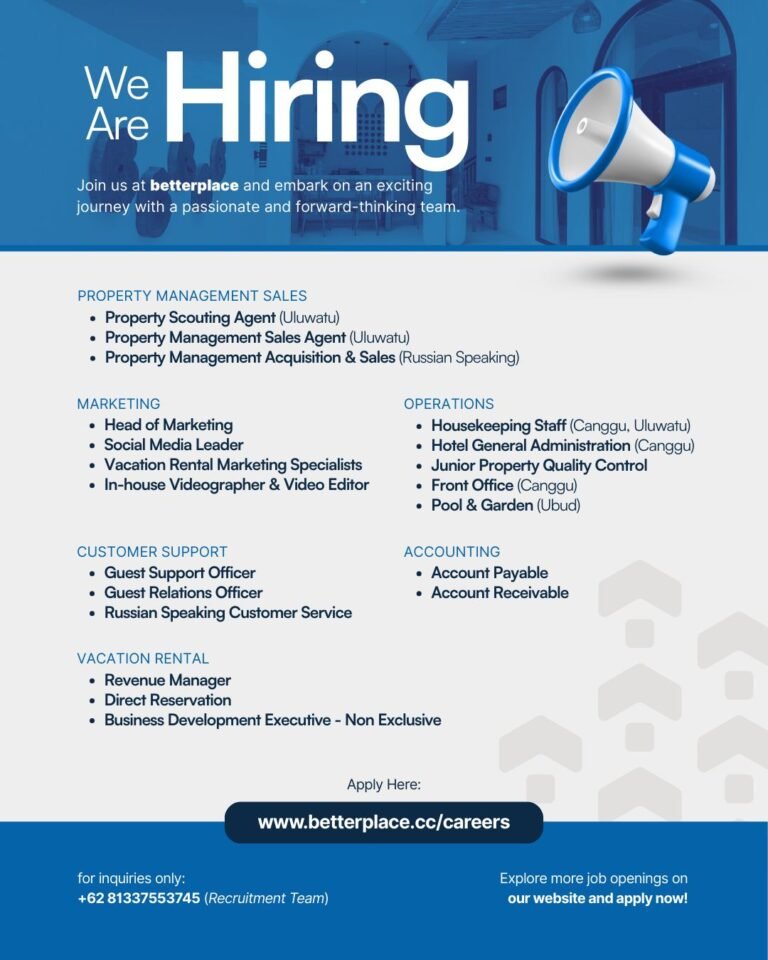 LOKER.BALINEWS.ID, BALI — Peluang karir di industri pengelolaan properti kini terbuka lebar bagi para profesional yang ingin berkembang bersama tim yang progresif. Betterplace secara resmi mengumumkan pembukaan rekrutmen besar-besaran untuk mengisi berbagai posisi strategis di beberapa wilayah populer seperti Canggu, Uluwatu, dan Ubud. Langkah ini merupakan bagian dari komitmen perusahaan dalam memberikan layanan manajemen properti kelas dunia bagi pemilik aset dan tamu di destinasi wisata utama Pulau Dewata.