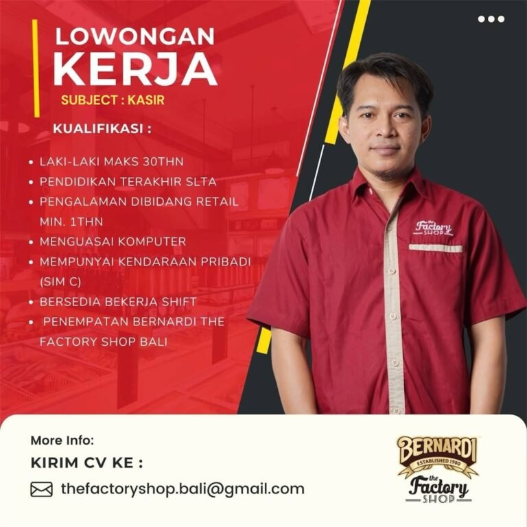LOKER.BALINEWS.ID, BALI – Bernardi The Factory Shop, salah satu gerai retail ternama yang dikenal dengan produk olahan daging berkualitas, saat ini sedang membuka kesempatan karir bagi individu yang berdedikasi. Perusahaan mengumumkan rekrutmen untuk posisi Kasir guna memperkuat tim operasional di wilayah Bali. Lowongan ini ditujukan bagi tenaga kerja pria yang memiliki semangat melayani dan ketelitian dalam mengelola transaksi keuangan di toko.