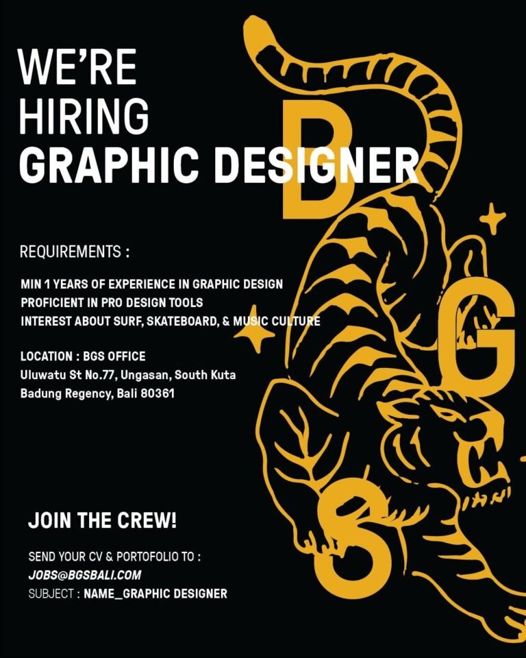 Bagi Anda yang merasa memiliki kualifikasi tersebut dan siap menjadi bagian dari kru BGS, segera kirimkan CV serta portofolio terbaik Anda melalui email ke jobs@bgsbali.com. Pastikan untuk mencantumkan subjek email dengan format: NAME_GRAPHIC DESIGNER untuk memudahkan proses verifikasi oleh tim rekrutmen. Jangan lewatkan kesempatan untuk bekerja di lingkungan yang inspiratif dan penuh energi di wilayah Ungasan ini.