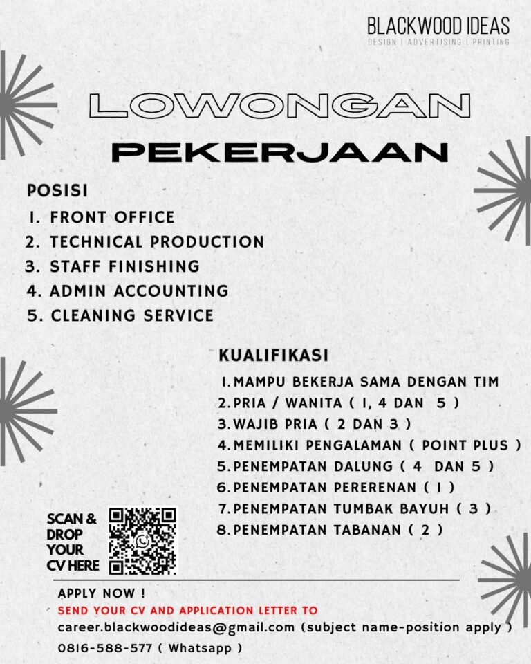 Kualifikasi umum yang ditetapkan oleh pihak manajemen Blackwood Ideas adalah kemampuan kandidat untuk bekerja sama dalam tim serta memiliki pengalaman kerja yang akan menjadi nilai tambah bagi pelamar. Secara spesifik, penempatan kerja dibagi ke dalam beberapa wilayah; posisi Admin Accounting dan Cleaning Service akan ditempatkan di Dalung, Front Office di Pererenan, Staff Finishing di Tumbak Bayuh, sementara Technical Production akan ditempatkan di Tabanan. Bagi calon pelamar yang berminat, aplikasi berupa CV dan surat lamaran dapat dikirimkan langsung melalui email ke career.blackwoodideas@gmail.com dengan subjek nama-posisi, atau melalui koordinasi via WhatsApp di nomor 0816-588-577.
