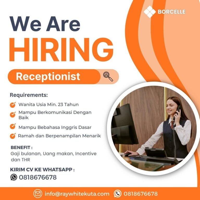 LOKER.BALINEWS.ID, BADUNG – Industri real estate di kawasan Kuta terus berkembang, dan kini Borcelle yang berafiliasi dengan Ray White Kuta sedang mencari talenta baru untuk memperkuat garda depan mereka. Saat ini, perusahaan secara resmi membuka lowongan kerja untuk posisi Receptionist. Peran ini sangat strategis karena menjadi titik kontak utama bagi klien dan mitra bisnis di salah satu agen properti terkemuka di wilayah Badung.