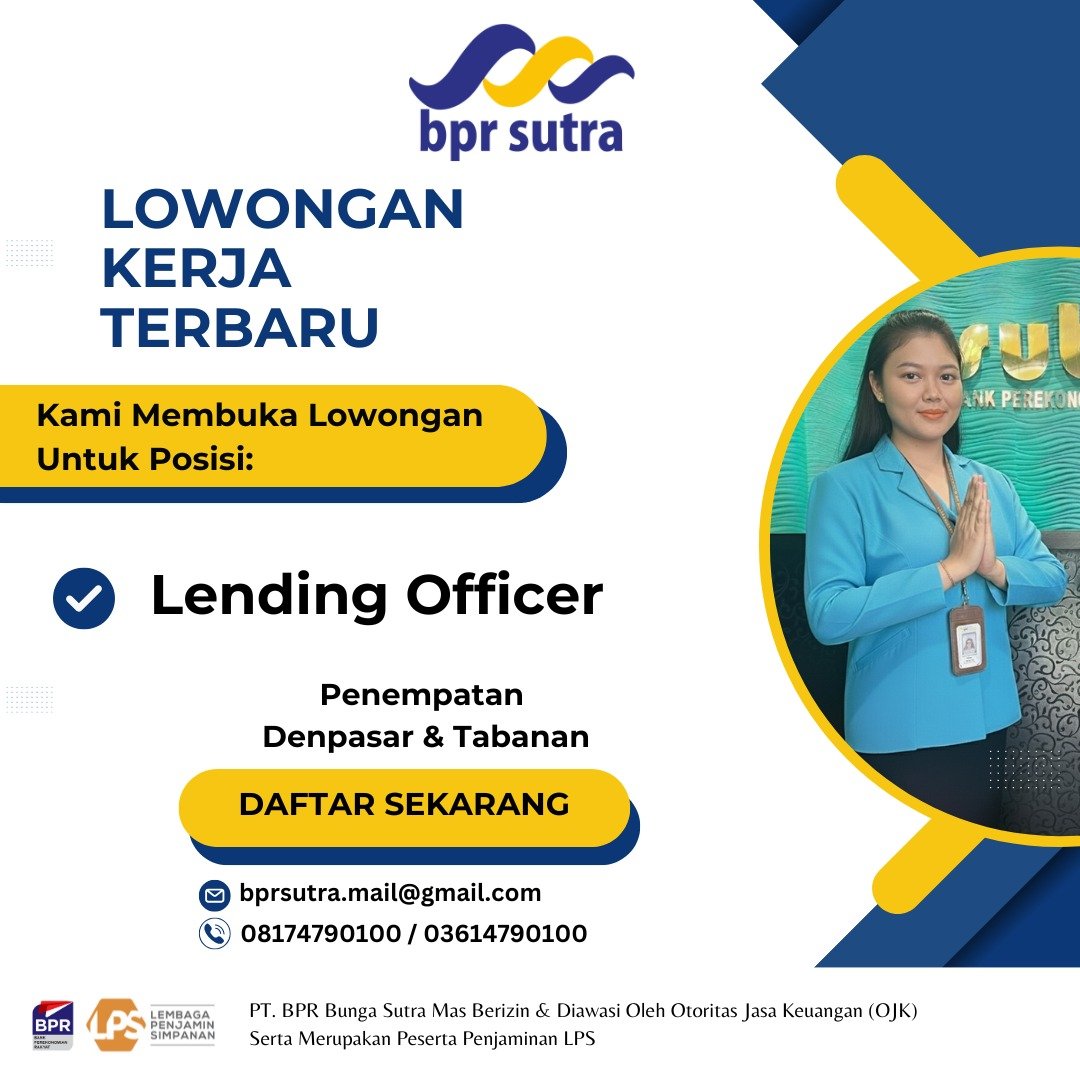 LOKER.BALINEWS.ID, DENPASAR – PT. BPR Bunga Sutra Mas (BPR Sutra), sebuah lembaga perbankan yang telah berizin dan diawasi oleh Otoritas Jasa Keuangan (OJK) serta merupakan peserta penjaminan LPS, saat ini membuka kesempatan karier bagi para profesional perbankan di Bali. Perusahaan sedang mencari kandidat yang kompeten untuk mengisi posisi sebagai Lending Officer. Lowongan ini merupakan peluang emas bagi individu yang ingin mengembangkan karier di industri jasa keuangan yang aman dan terpercaya.