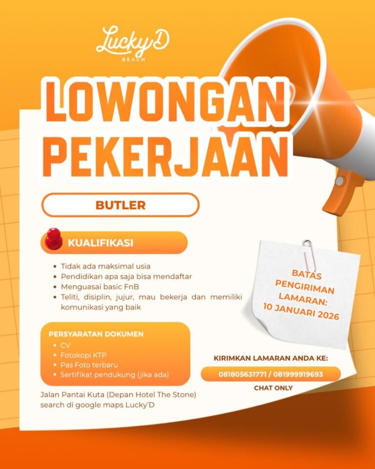 LOKER.BALINEWS.ID, BADUNG – Lucky D Beach yang berlokasi di kawasan Pantai Kuta, Bali saat ini membuka lowongan kerja Bali untuk posisi Butler. Kesempatan ini terbuka bagi pelamar dari berbagai latar belakang pendidikan tanpa batasan usia, yang memiliki minat dan kemampuan dasar di bidang Food & Beverage (FnB).