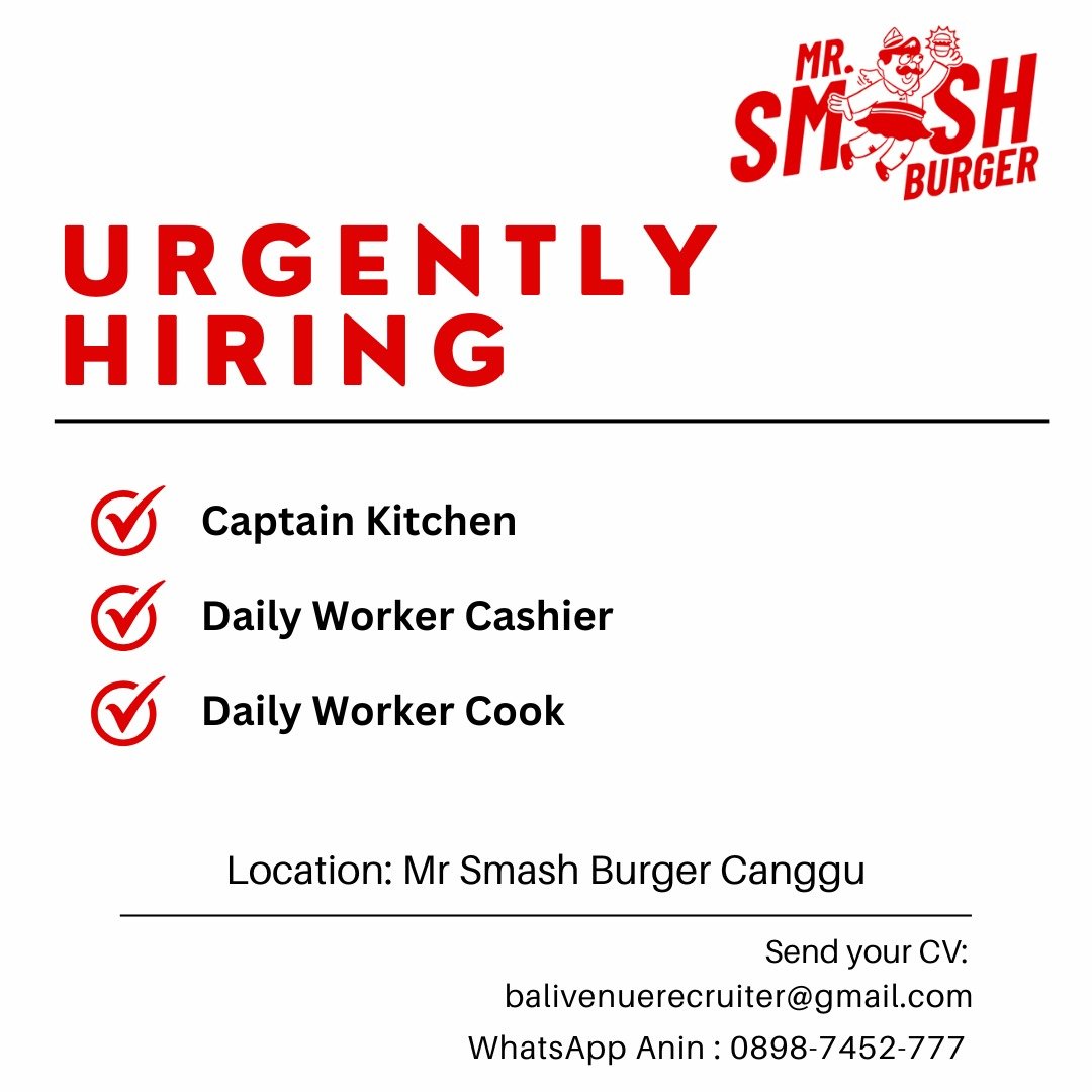 LOKER.BALINEWS.ID, CANGGU – Mr Smash Burger, salah satu gerai makanan cepat saji yang tengah berkembang di kawasan Canggu, membuka lowongan kerja untuk tiga posisi sekaligus, yaitu Captain Kitchen, Daily Worker Cashier, dan Daily Worker Cook. Kebutuhan tenaga kerja ini bersifat mendesak untuk mendukung operasional harian yang semakin meningkat.