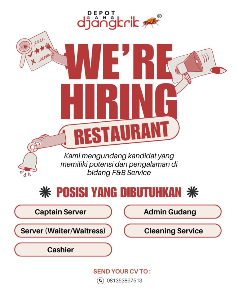 LOKER.BALINEWS.ID, DENPASAR – Depot Gang Djangkrik saat ini membuka lowongan kerja Bali bagi kandidat yang bersemangat dan ingin berkembang di industri Food & Beverage (F&B). Adapun posisi yang dibutuhkan meliputi Captain Server, Server (Waiter/Waitress), Cashier, Admin Gudang, dan Cleaning Service.
