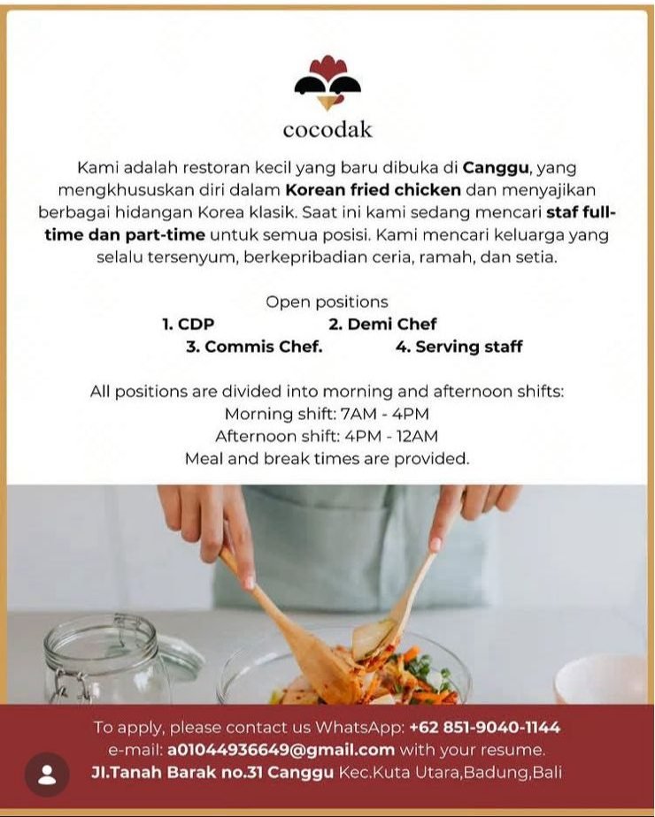 LOKER.BALINEWS.ID, BADUNG – Cocodak, sebuah restoran Korea yang baru saja dibuka di kawasan Canggu, saat ini sedang mencari tenaga kerja profesional untuk memperkuat tim operasionalnya. Restoran yang mengkhususkan diri pada menu Korean Fried Chicken dan hidangan klasik Korea ini membuka lowongan untuk empat posisi sekaligus, yakni Chef de Partie (CDP), Demi Chef, Commis Chef, dan Serving Staff. Kesempatan ini terbuka bagi pelamar yang mencari pekerjaan baik dengan status full-time maupun part-time.