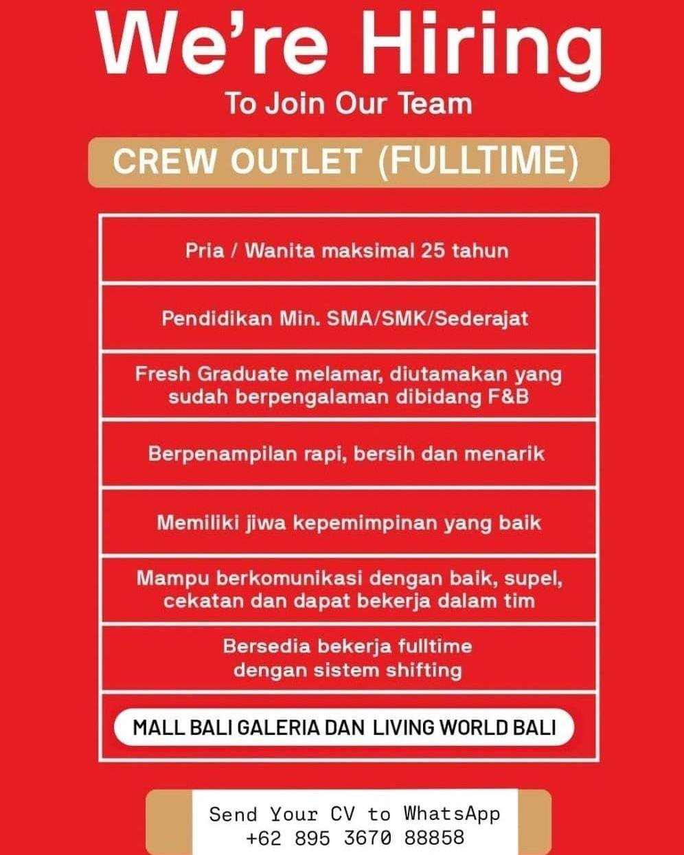 Kriteria yang dicari adalah pria maupun wanita dengan usia maksimal 25 tahun dan latar belakang pendidikan minimal SMA/SMK sederajat. Meskipun terbuka bagi lulusan baru (fresh graduate), kandidat yang memiliki pengalaman di bidang F&B lebih diutamakan untuk posisi ini. Pelamar diharapkan memiliki penampilan rapi, bersih, dan menarik, serta memiliki kemampuan komunikasi yang baik, cekatan, dan mampu bekerja secara tim. Selain itu, kandidat harus bersedia bekerja dalam sistem shifting sesuai dengan jam operasional mall. Bagi Anda yang tertarik, segera kirimkan CV terbaru melalui WhatsApp di nomor +62 895 3670 88858.