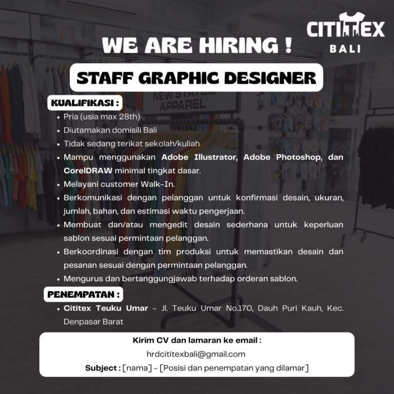 Kandidat yang dicari wajib memiliki kemampuan dasar dalam mengoperasikan perangkat lunak desain seperti Adobe Illustrator, Adobe Photoshop, dan CorelDRAW. Tugas utama meliputi pembuatan atau pengeditan desain sederhana sesuai permintaan konsumen, melakukan konfirmasi teknis terkait pesanan, serta berkoordinasi dengan tim produksi. Bagi Anda yang memenuhi kualifikasi, lamaran dapat dikirimkan melalui email ke hrdcititexbali@gmail.com dengan subjek [nama] – [Posisi dan penempatan yang dilamar].