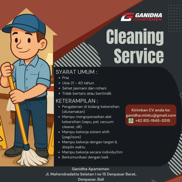 LOKER.BALINEWS.ID, DENPASAR BARAT – Ganidha Apartemen saat ini membuka lowongan kerja Bali untuk posisi Cleaning Service dengan penempatan di area Denpasar Barat. Lowongan ini dibuka bagi kandidat pria yang siap bekerja di bidang kebersihan dan perawatan lingkungan apartemen.