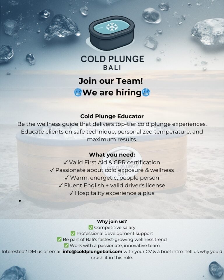 LOKER.BALINEWS.ID, BALI – Industri kesehatan dan kebugaran (wellness) yang tengah berkembang pesat di Pulau Dewata kini membuka peluang karir baru melalui Cold Plunge Bali. Perusahaan ini sedang mencari kandidat inovatif untuk mengisi posisi sebagai Cold Plunge Educator. Peran utama dari posisi ini adalah menjadi pemandu wellness yang memberikan pengalaman cold plunge terbaik bagi klien, termasuk mengedukasi mereka mengenai teknik yang aman serta suhu yang dipersonalisasi untuk mencapai hasil maksimal.