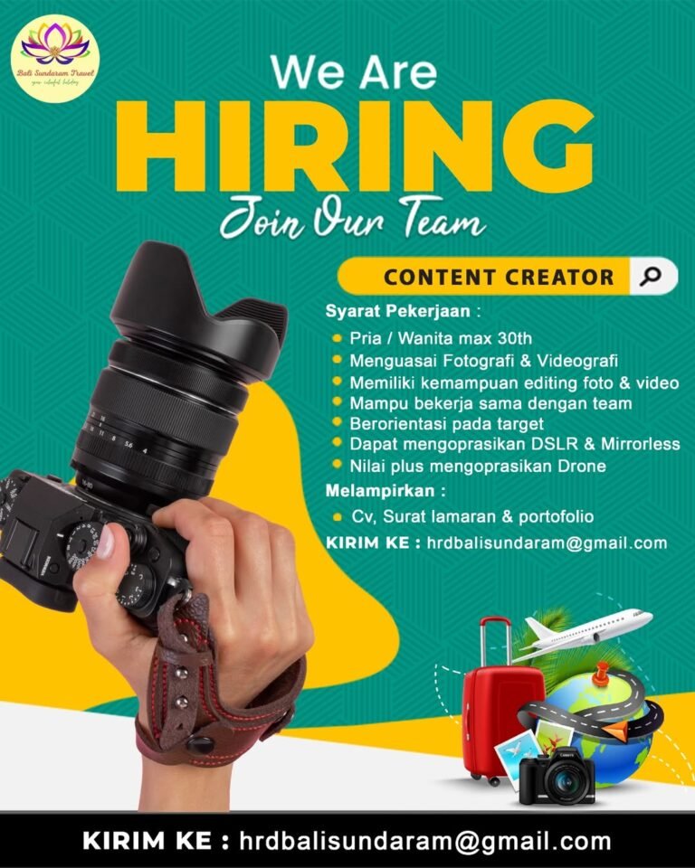 LOKER.BALINEWS.ID, GIANYAR – Kami membuka kesempatan bagi kamu yang kreatif dan bersemangat untuk bergabung sebagai Content Creator. Dalam peran ini, kamu akan bertanggung jawab membuat konten foto dan video yang menarik, mengabadikan momen perjalanan, serta mengolahnya menjadi materi visual yang informatif dan inspiratif. Kreativitas, kepekaan terhadap detail, dan kemampuan bercerita melalui visual sangat dibutuhkan untuk mendukung branding dan promosi perusahaan.