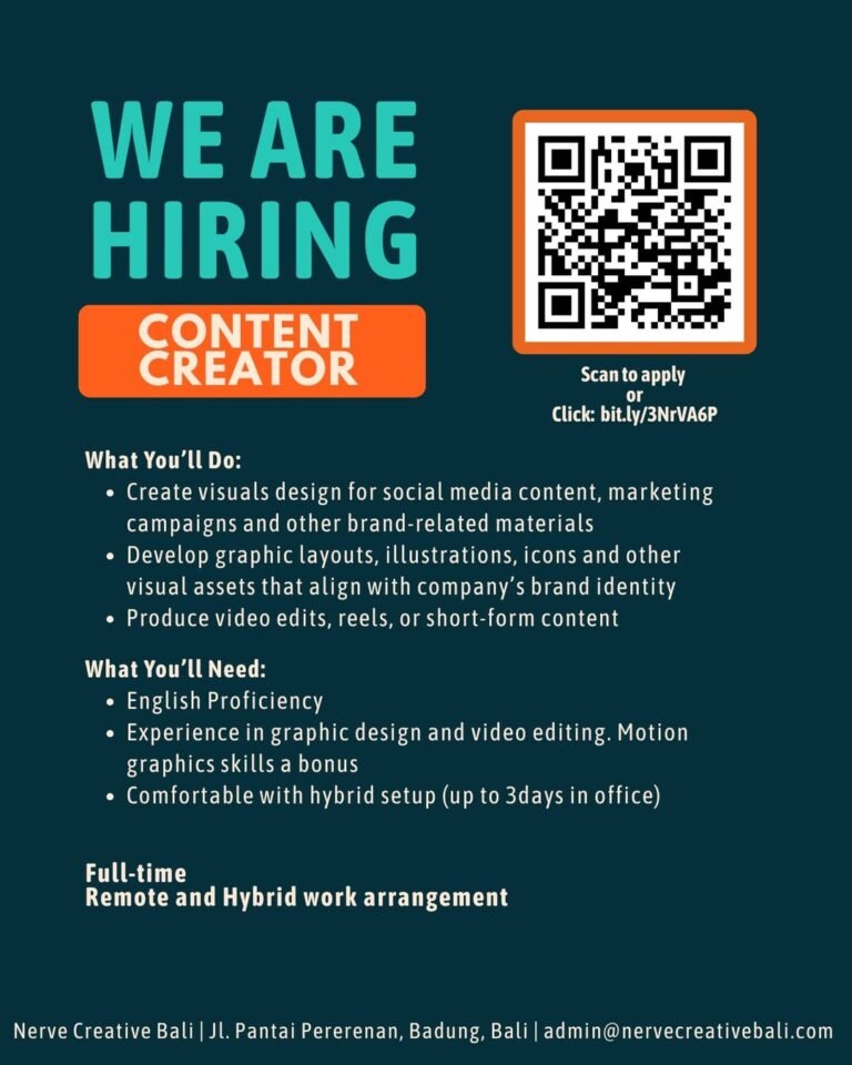 Bagi Anda yang tertarik, pendaftaran dapat dilakukan dengan memindai kode QR yang tertera pada poster atau melalui tautan bit.ly/3NrVA6P. Untuk informasi lebih lanjut, pelamar juga dapat menghubungi pihak manajemen melalui email di admin@nervecreativebali.com. Pastikan profil dan portofolio Anda telah disiapkan untuk menunjukkan kemampuan terbaik Anda dalam dunia kreatif digital.