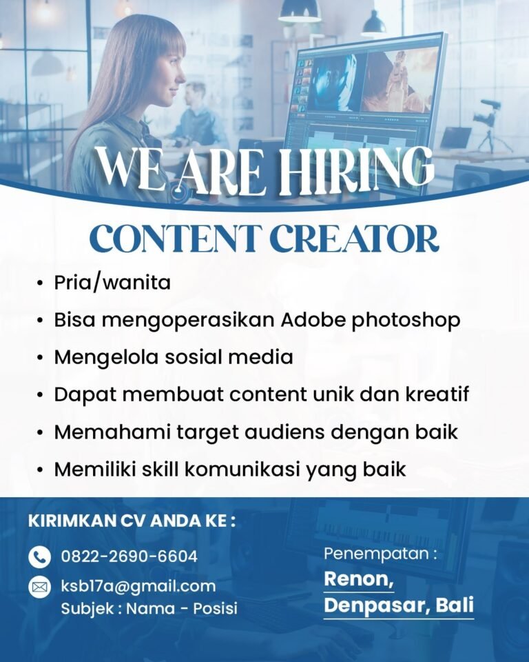 LOKER.BALINEWS.ID, DENPASAR – Dunia digital yang berkembang pesat di Bali membuka kesempatan bagi para kreator muda untuk bergabung sebagai Content Creator di wilayah Renon, Denpasar. Lowongan ini terbuka bagi pria maupun wanita yang memiliki kemampuan komunikasi yang baik serta pemahaman yang mendalam terhadap target audiens. Perusahaan mencari sosok yang mampu mengelola media sosial secara profesional dan inovatif.