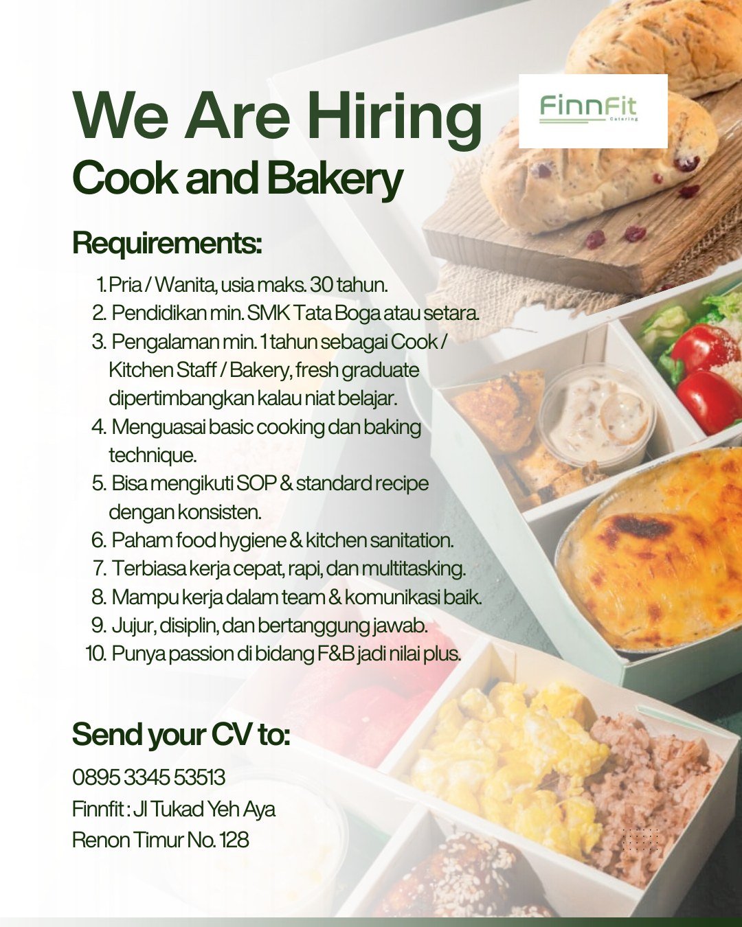 FinnFit mencari kandidat pria atau wanita dengan usia maksimal 30 tahun dan latar belakang pendidikan minimal SMK Tata Boga atau setara. Pelamar diharapkan memiliki pengalaman minimal 1 tahun di bidang terkait, namun para lulusan baru (fresh graduate) tetap dipertimbangkan asalkan memiliki keinginan kuat untuk belajar. Kemampuan menguasai teknik dasar memasak dan membuat roti (baking), serta pemahaman yang baik mengenai sanitasi dapur dan kebersihan makanan (food hygiene), menjadi poin utama yang dicari oleh manajemen.