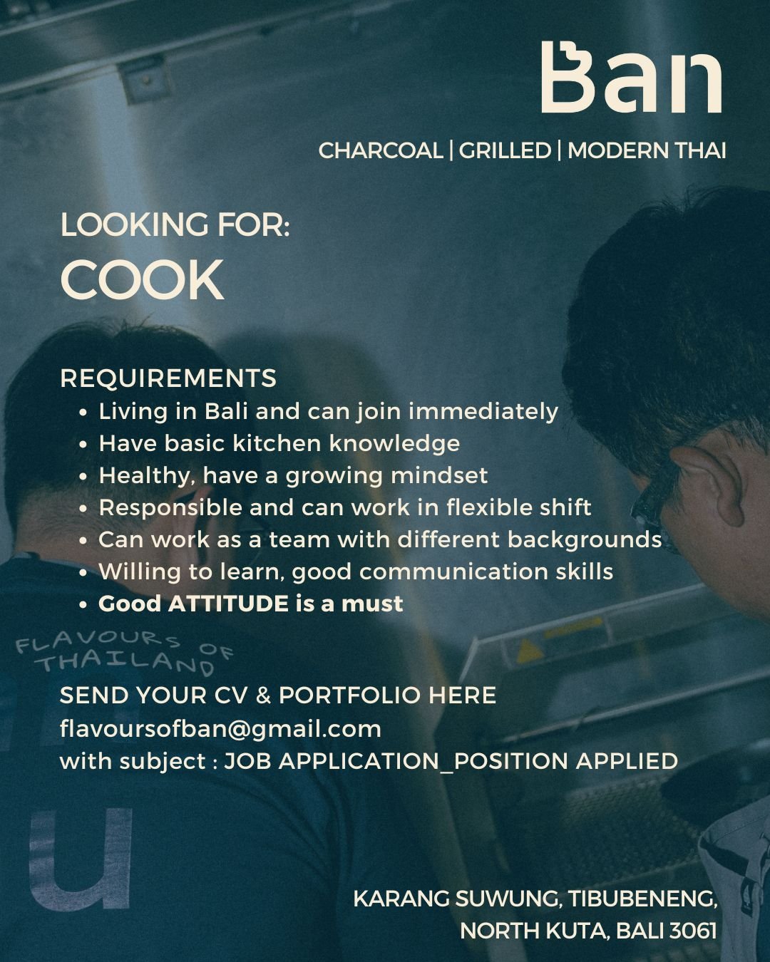 LOKER.BALINEWS.ID, BALI — Restoran Ban yang dikenal dengan konsep charcoal grilled dan modern Thai membuka Lowongan Kerja Bali Cook di Ban untuk memperkuat tim dapur mereka di kawasan Tibubeneng, North Kuta. Rekrutmen ini menyasar kandidat yang siap bergabung segera dan mampu bekerja di lingkungan operasional yang dinamis.
