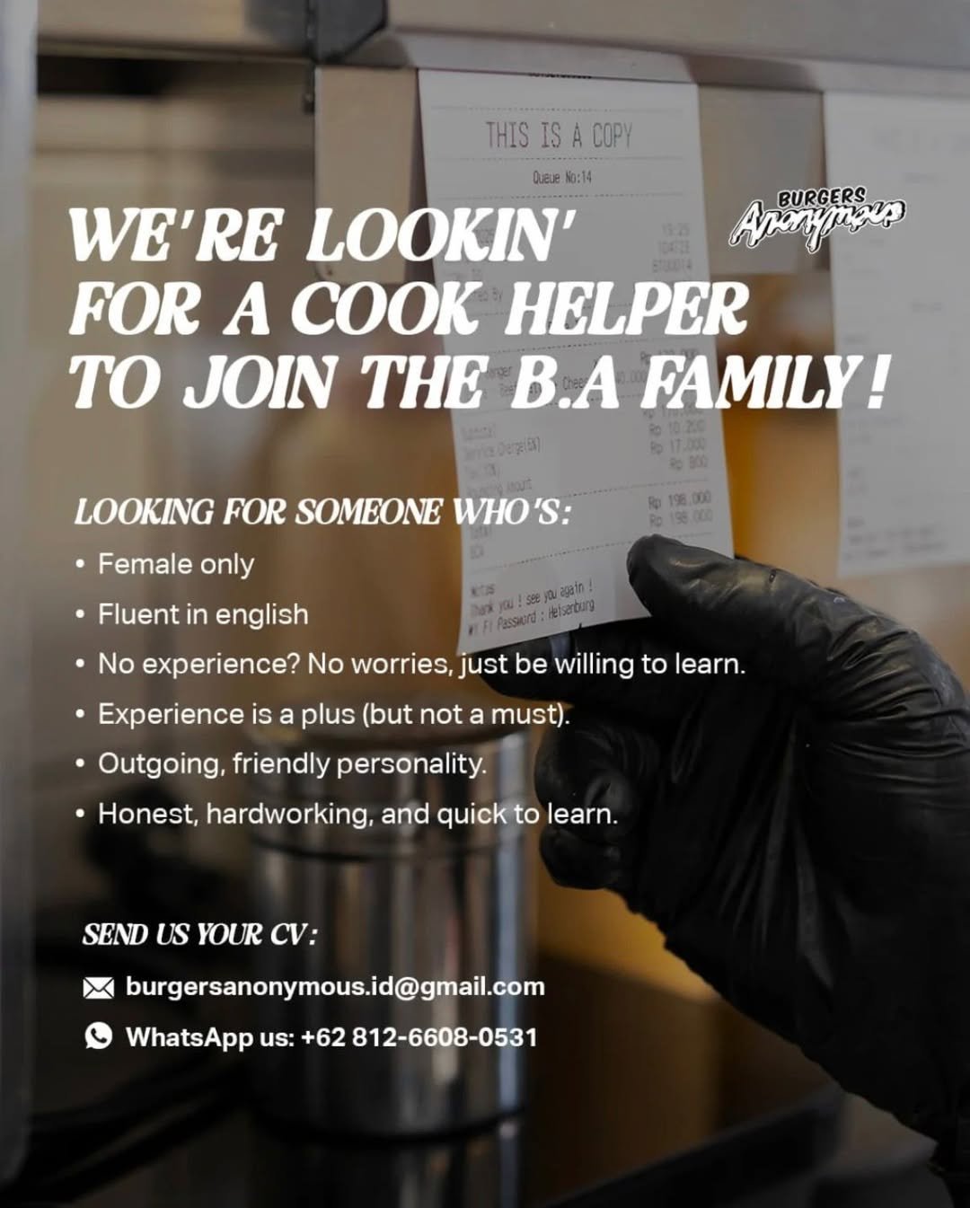 Kirimkan CV dan lamaran melalui email: burgersanonymous.id@gmail.com