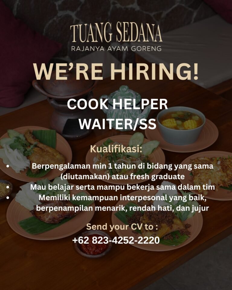 LOKER.BALINEWS.ID, BALI — Tuang Sedana Rajanya Ayam Goreng sedang membuka peluang karir bagi individu yang bersemangat di bidang kuliner untuk mengisi posisi sebagai Cook Helper dan Waiter/ss. Usaha kuliner yang dikenal dengan hidangan khas ayam gorengnya ini mencari kandidat yang memiliki kemauan belajar tinggi serta mampu bekerja sama secara solid di dalam tim.