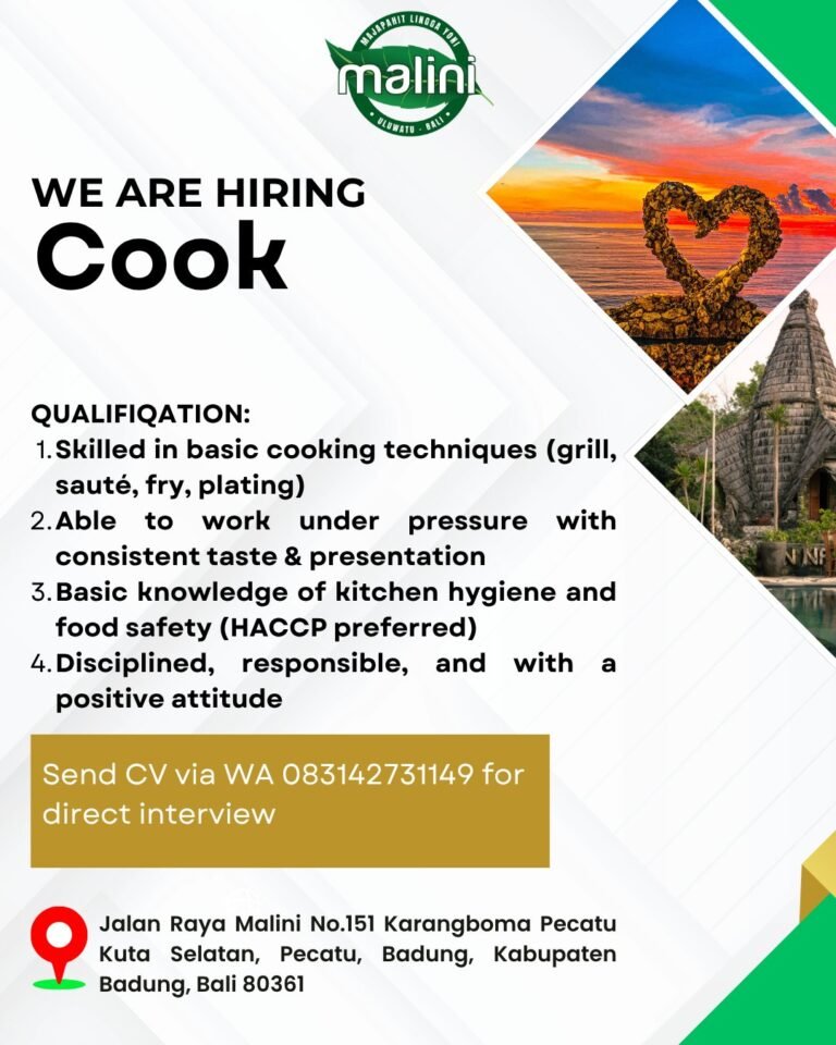 LOKER.BALINEWS.ID, BADUNG – Kesempatan kerja terbaru di kawasan Pecatu, Kuta Selatan, Kabupaten Badung. Malini Uluwatu Bali saat ini membuka lowongan kerja untuk beberapa posisi, antara lain Cook, Security Guard, dan Engineering Staff. Lowongan ini terbuka bagi kandidat yang memiliki sikap disiplin, bertanggung jawab, serta siap bekerja dalam lingkungan hospitality.