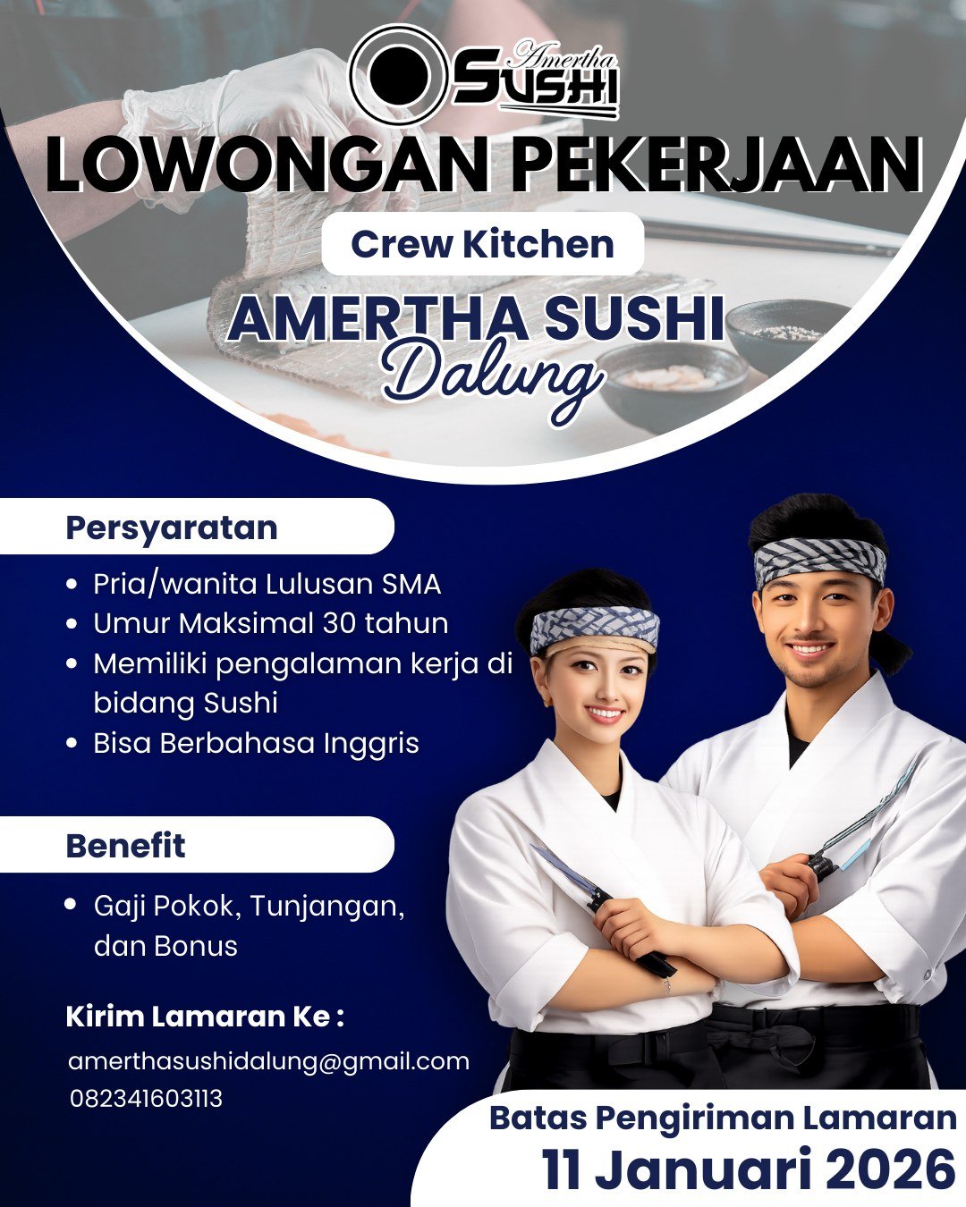 LOKER.BALINEWS.ID, BADUNG — Dibuka Lowongan Kerja Bali Crew Kitchen di Amertha Sushi Dalung bagi kandidat yang memiliki ketertarikan pada industri kuliner Jepang. Perusahaan menghadirkan kesempatan kerja untuk pria maupun wanita lulusan SMA, dengan batas usia maksimal 30 tahun. Pelamar diutamakan memiliki pengalaman kerja di bidang sushi dan mampu berbahasa Inggris untuk mendukung komunikasi operasional harian.