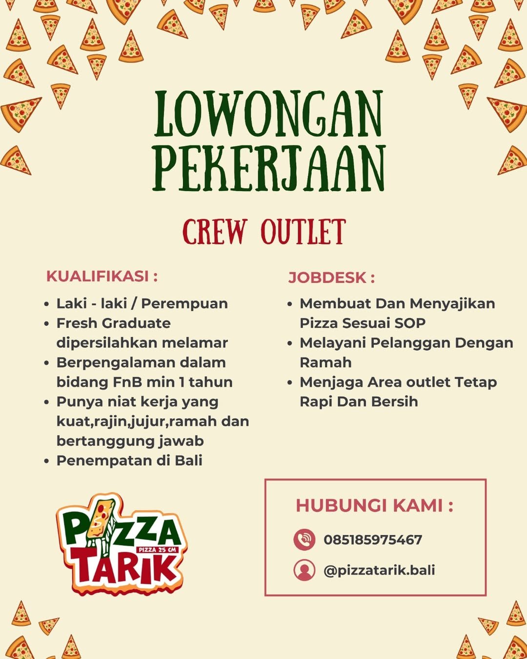 Bagi Anda yang memenuhi kriteria tersebut dan ingin mengembangkan keahlian di dunia kuliner, segera siapkan berkas lamaran Anda. Proses pendaftaran dan informasi lebih lanjut dapat dilakukan dengan menghubungi tim rekrutmen melalui layanan pesan WhatsApp di nomor 0851-8597-5467 atau melalui akun media sosial resmi di @pizzatarik.bali.