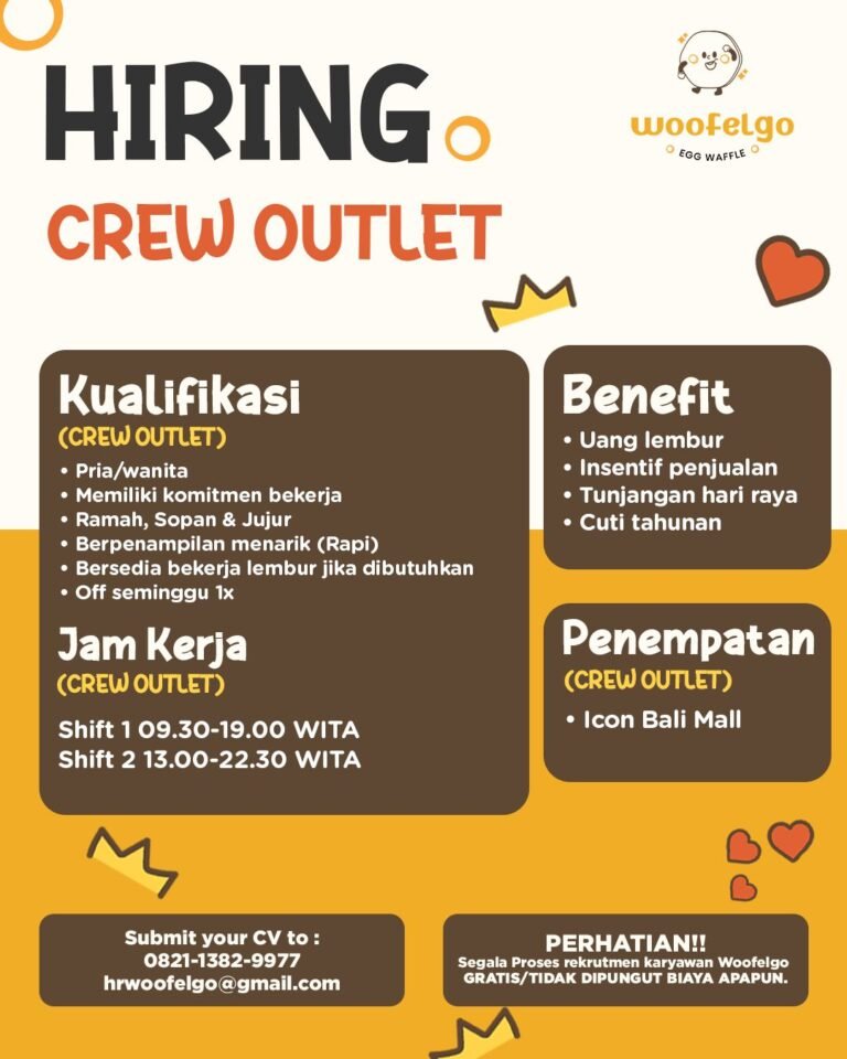 LOKER.BALINEWS.ID, DENPASAR – Woofelgo, salah satu brand kuliner yang berfokus pada hidangan egg waffle, saat ini sedang membuka kesempatan berkarir bagi tenaga kerja lokal untuk mengisi posisi sebagai Crew Outlet. Kesempatan ini terbuka bagi individu yang berdomisili di wilayah Denpasar dan sekitarnya, mengingat lokasi penempatan berada di salah satu pusat perbelanjaan terbaru dan tersibuk di kawasan Sanur, yaitu Icon Bali Mall.