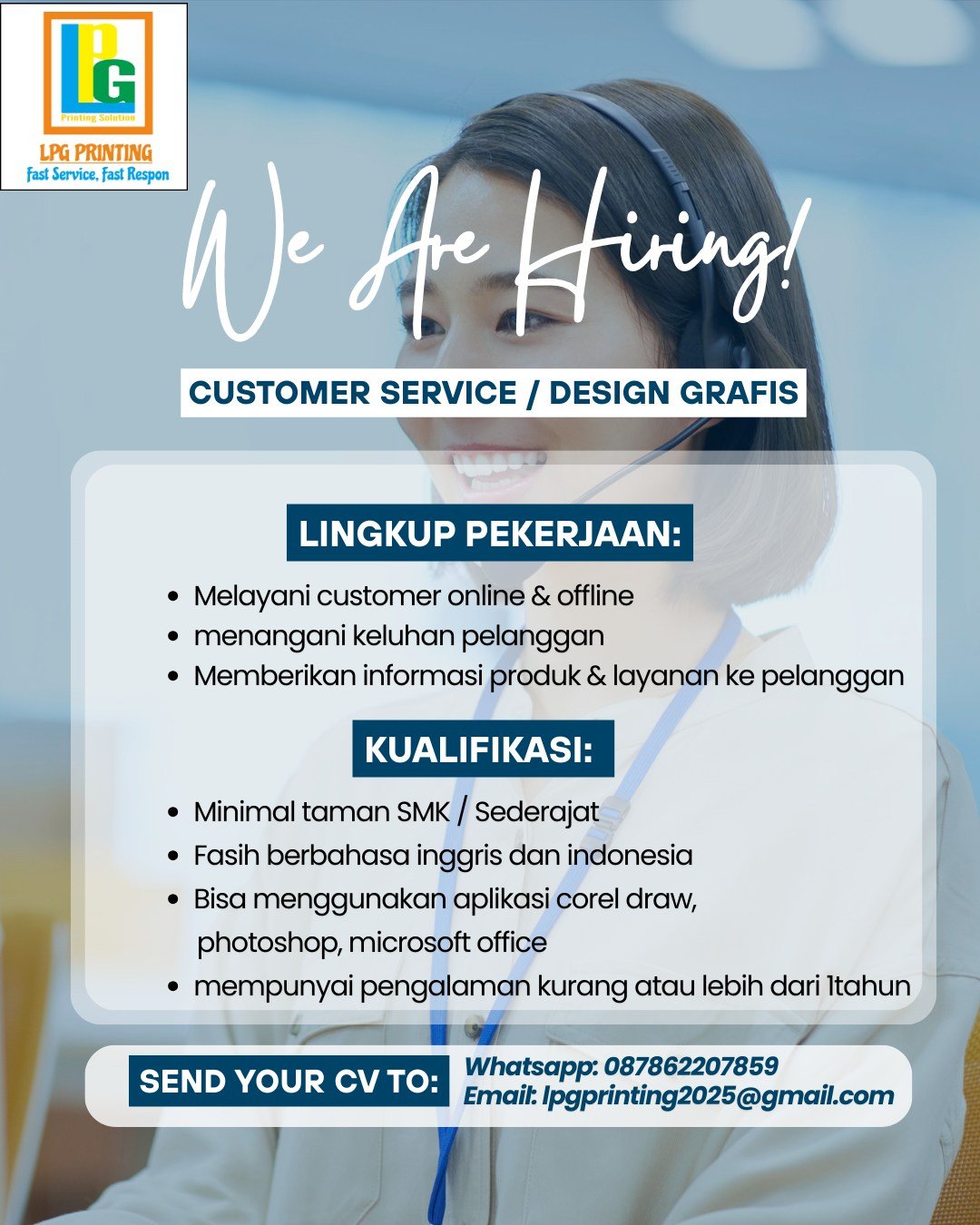 LOKER.BALINEWS.ID, BALI — LPG Printing membuka lowongan kerja untuk posisi Customer Service / Design Grafis guna mendukung layanan percetakan yang terus berkembang. Perusahaan mencari kandidat yang siap melayani pelanggan secara online maupun offline, serta mampu memberikan solusi atas kebutuhan percetakan dan keluhan pelanggan.