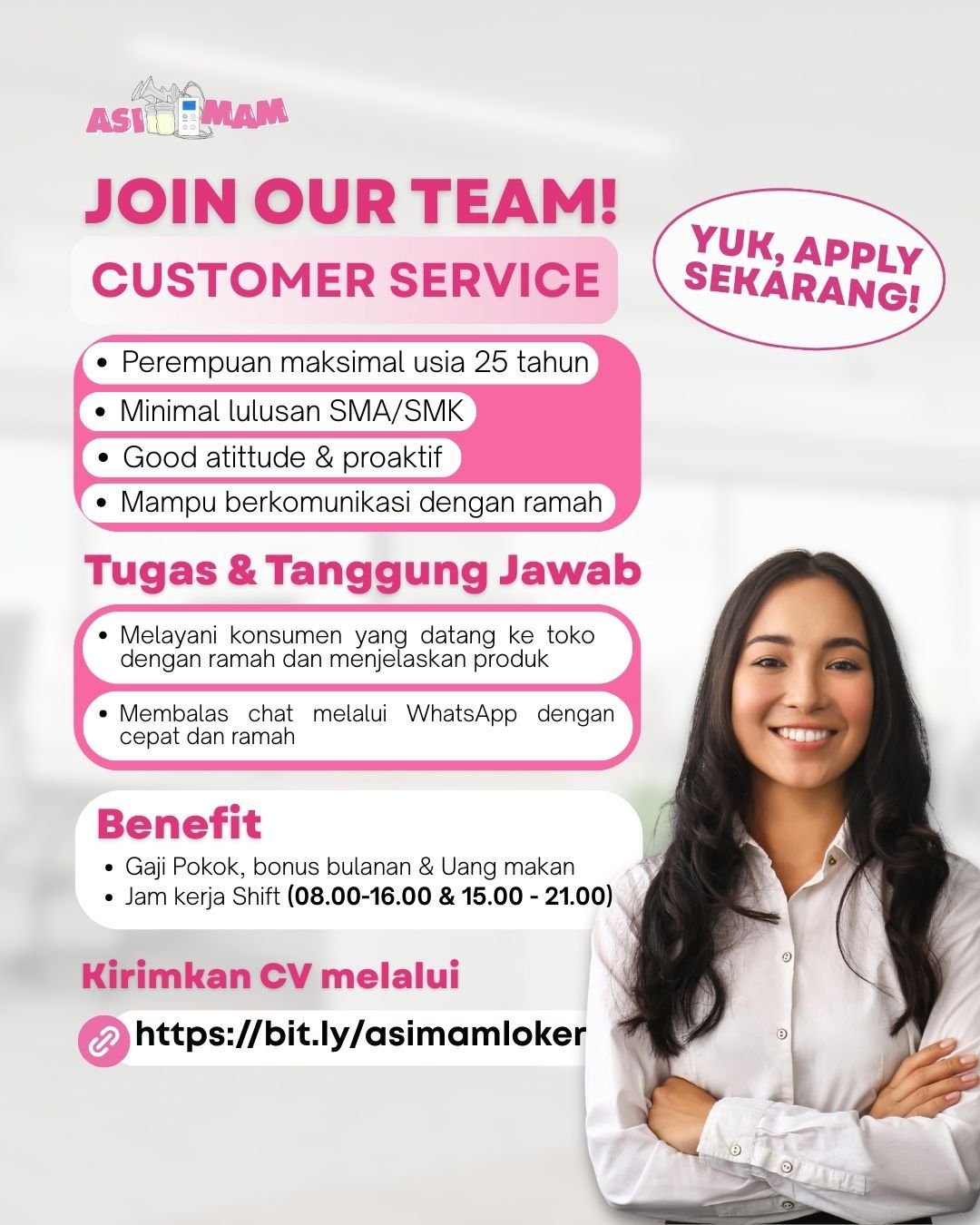 Kandidat yang dicari adalah perempuan dengan usia maksimal 25 tahun dan latar belakang pendidikan minimal lulusan SMA/SMK. Pelamar diwajibkan memiliki sikap yang baik (good attitude), komunikatif, serta mampu melayani konsumen dengan ramah. Adapun tanggung jawab utama posisi ini meliputi melayani konsumen yang datang ke toko, menjelaskan produk, serta membalas pesan masuk melalui WhatsApp dengan cepat dan tepat.