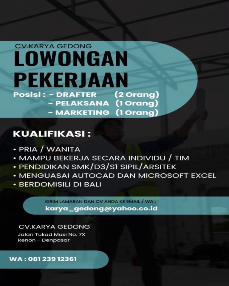 Dalam persyaratannya, perusahaan mencari pelamar dengan latar belakang pendidikan SMK/D3/S1 jurusan Sipil atau Arsitek, menguasai AutoCAD dan Microsoft Excel, serta berdomisili di Bali. Pelamar yang memenuhi kriteria dapat mengirimkan lamaran dan CV melalui email karya_gedong@yahoo.co.id atau menghubungi WhatsApp 081 239 12361. Rekrutmen ini dibuka hingga posisi terpenuhi.