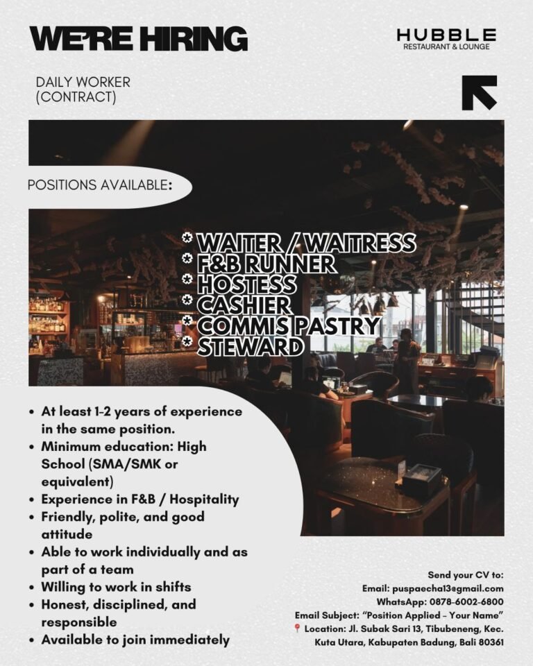 LOKER.BALINEWS.ID, BADUNG – Hubble Restaurant & Lounge yang berlokasi di Tibubeneng, Kuta Utara, saat ini sedang membuka peluang karir bagi para profesional di bidang hospitality untuk bergabung sebagai Daily Worker (Contract). Terdapat berbagai posisi yang tersedia guna memperkuat operasional tim, di antaranya adalah Waiter/Waitress, F&B Runner, Hostess, Cashier, Commis Pastry, hingga Steward. Lowongan ini ditujukan bagi individu yang siap bekerja segera dan bersedia mengikuti sistem kerja shift di lingkungan restoran dan lounge yang dinamis.