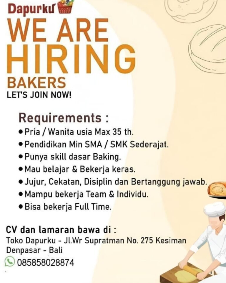 LOKER.BALINEWS.ID, DENPASAR – Dapurku, unit usaha yang bergerak di bidang kuliner dan toko roti di Denpasar, kembali membuka peluang karir bagi individu kreatif yang memiliki minat dalam dunia baking untuk mengisi posisi Bakers. Lowongan ini ditujukan bagi mereka yang ingin berkembang bersama tim profesional dalam menghasilkan produk roti dan kue berkualitas tinggi. Kandidat yang terpilih akan ditempatkan di outlet utama Dapurku yang berlokasi strategis di Jl. WR Supratman No. 275, Kesiman, Denpasar.