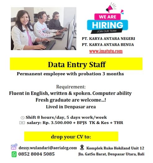 LOKER.BALINEWS.ID, DENPASAR — PT Karya Antara Negeri dan PT Karya Antara Benua membuka kesempatan karier bagi kandidat yang ingin bergabung sebagai Data Entry Staff. Posisi ini ditawarkan sebagai karyawan tetap dengan masa percobaan selama tiga bulan, dan ditempatkan di area Denpasar.