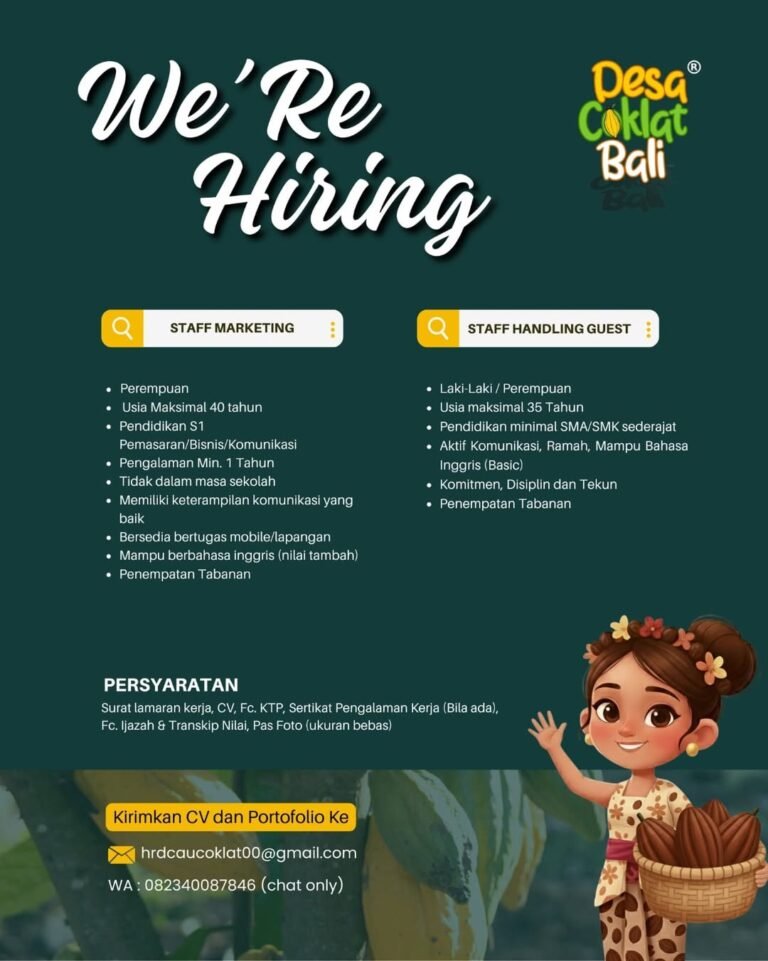 LOKER.BALINEWS.ID, TABANAN – Destinasi wisata edukasi Desa Coklat Bali yang berlokasi di Kabupaten Tabanan sedang memperluas tim operasionalnya dengan membuka peluang karir baru. Perusahaan saat ini membutuhkan tenaga profesional untuk mengisi dua posisi strategis, yaitu Staff Marketing dan Staff Handling Guest. Kesempatan ini ditujukan bagi individu yang memiliki semangat kerja tinggi dan kemampuan komunikasi yang baik untuk ditempatkan langsung di wilayah Tabanan.