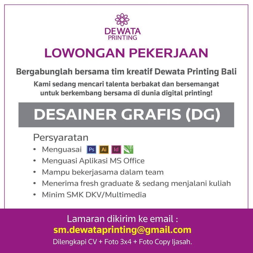 LOKER.BALINEWS.ID, BALI – Dewata Printing Bali, sebuah perusahaan yang bergerak di industri percetakan digital, saat ini sedang mencari talenta berbakat dan bersemangat untuk bergabung dengan tim kreatif mereka. Perusahaan membuka dua posisi strategis, yaitu Desainer Grafis (DG) dan Administrasi (ADM). Untuk posisi Desainer Grafis, lowongan ini terbuka bagi lulusan minimal SMK DKV/Multimedia, termasuk bagi fresh graduate maupun mahasiswa yang sedang menjalani kuliah. Kandidat diwajibkan menguasai perangkat lunak desain seperti Photoshop, Illustrator, CorelDraw, dan InDesign, serta mampu bekerja sama dalam tim.