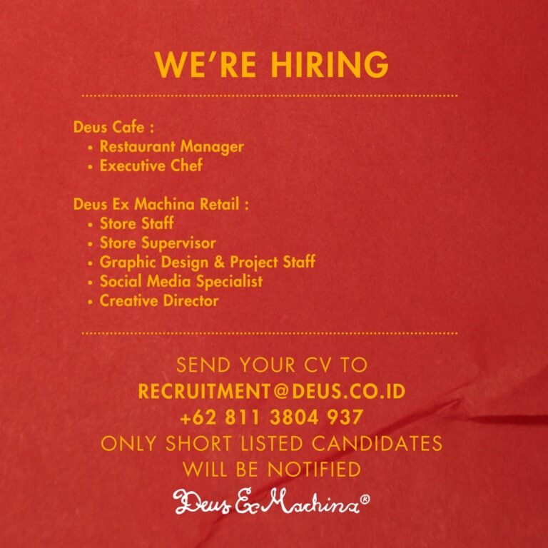 LOKER.BALINEWS.ID, BALI – Brand gaya hidup ternama, Deus Ex Machina, saat ini tengah membuka kesempatan karir besar-besaran bagi para profesional di Bali. Perusahaan sedang mencari kandidat untuk mengisi posisi strategis di dua unit bisnis utamanya, yaitu Deus Cafe dan Deus Ex Machina Retail. Untuk divisi Cafe, posisi yang tersedia meliputi Restaurant Manager dan Executive Chef, sementara untuk divisi Retail, lowongan dibuka mulai dari Store Staff, Store Supervisor, Graphic Design & Project Staff, Social Media Specialist, hingga Creative Director.
