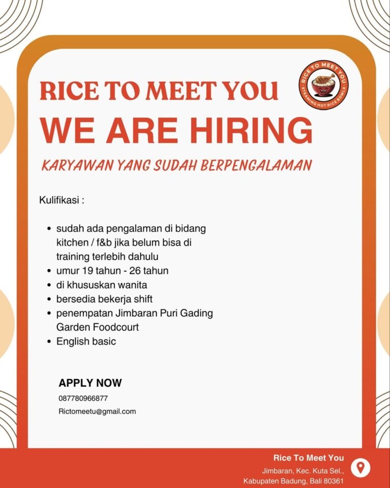 LOKER.BALINEWS.ID, BADUNG – Rice To Meet You, unit usaha kuliner yang berlokasi di Jimbaran, saat ini tengah membuka kesempatan berkarir bagi tenaga kerja wanita yang memiliki minat besar di bidang F&B. Lowongan ini dikhususkan bagi kandidat wanita dengan rentang usia 19 hingga 26 tahun untuk ditempatkan di cabang Jimbaran Puri Gading Garden Foodcourt. Perusahaan mengutamakan pelamar yang sudah memiliki pengalaman di bidang dapur (kitchen) atau F&B, namun tetap terbuka bagi kandidat potensial untuk diberikan pelatihan terlebih dahulu.