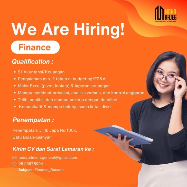 LOKER.BALINEWS.ID, GIANYAR — Perusahaan konstruksi dan pengembangan, Maha Rajeg, saat ini membuka kesempatan bagi profesional berpengalaman untuk bergabung sebagai Staff Finance. Posisi ini ditujukan bagi kandidat dengan latar belakang pendidikan S1 Akuntansi/Keuangan serta memiliki pengalaman minimal dua tahun di bidang budgeting atau FP&A. Perusahaan menekankan kemampuan dalam penguasaan Excel (pivot, lookup), penyusunan laporan keuangan, serta analisis varians dan kontrol anggaran.