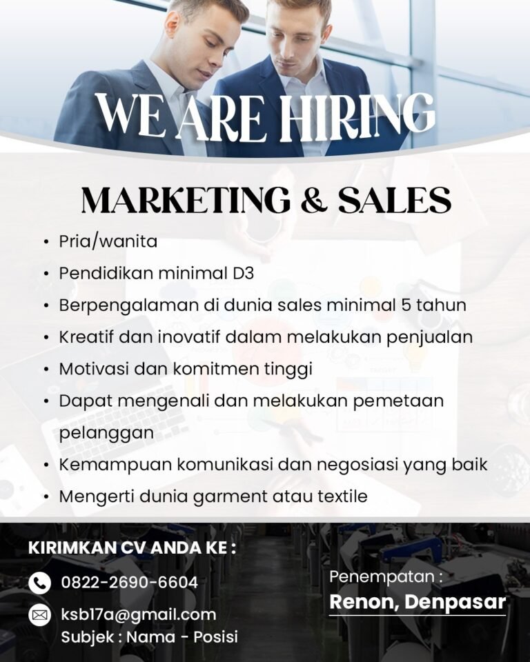 Kandidat yang dicari adalah individu yang mampu bekerjasama dalam tim dan memiliki kendaraan pribadi untuk mendukung mobilitas pekerjaan. Berbagai keuntungan menarik ditawarkan bagi pelamar yang berhasil bergabung, mulai dari gaji pokok, bonus atau insentif yang kompetitif, jaminan BPJS Ketenagakerjaan, hingga kesempatan pengembangan karir di masa depan. Lokasi kantor operasional berada di Jl. Campuan Asri Blok FF No. 39, Dalung Permai.