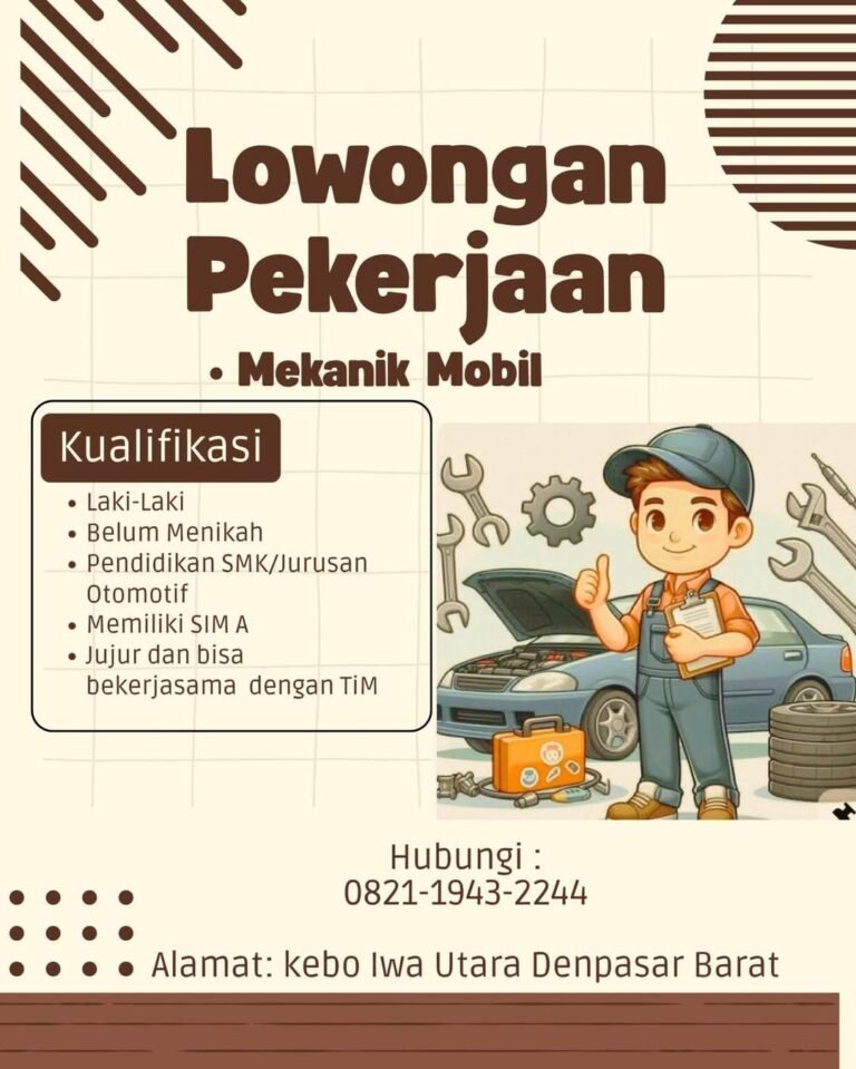 LOKER.BALINEWS.ID, DENPASAR – Sebuah bengkel otomotif yang berlokasi di kawasan strategis Kebo Iwa, Denpasar Barat, saat ini tengah membuka kesempatan berkarir bagi tenaga teknis berbakat untuk mengisi posisi Mekanik Mobil. Langkah rekrutmen ini dilakukan guna memenuhi kebutuhan teknisi yang andal dalam menangani perawatan dan perbaikan kendaraan pelanggan. Posisi ini menawarkan peluang bagi tenaga kerja lokal untuk berkembang di industri otomotif yang terus dinamis di wilayah ibu kota provinsi Bali.