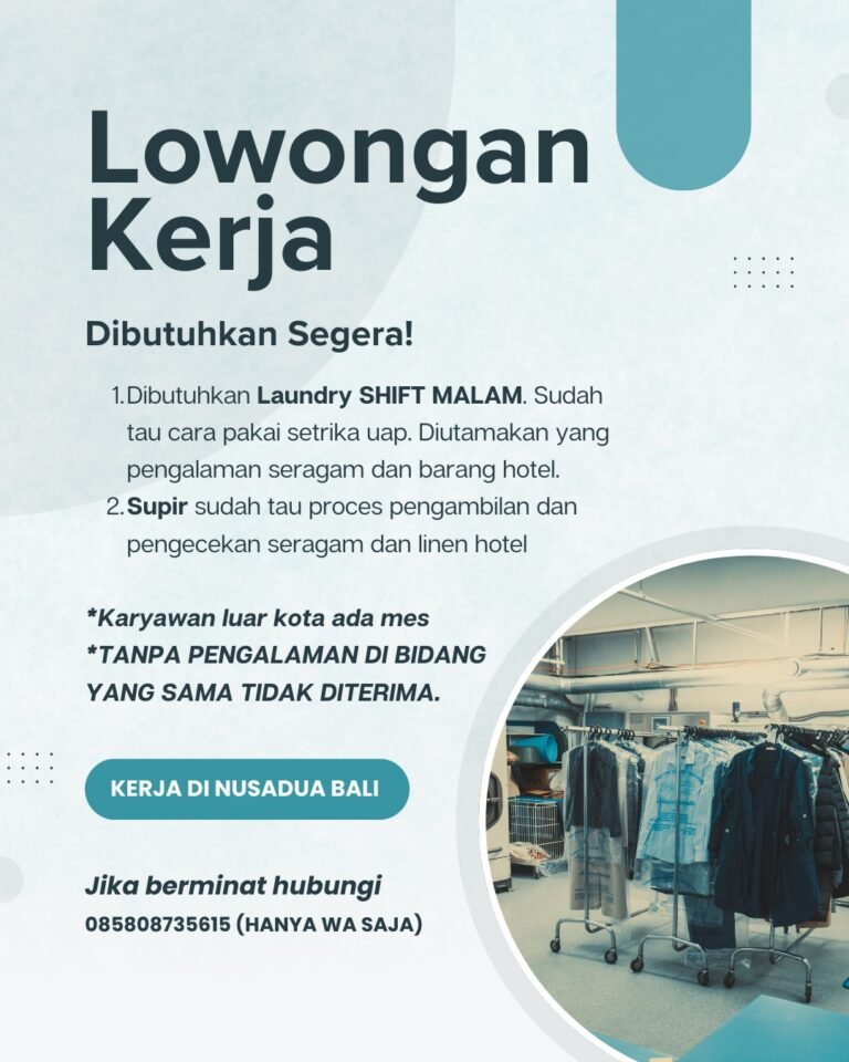 LOKER.BALINEWS.ID, BADUNG – Sebuah unit usaha jasa laundry yang berlokasi di kawasan strategis Nusa Dua, Bali, saat ini sedang membuka kesempatan berkarir bagi para pencari kerja melalui pembukaan lowongan kerja terbaru. Berdasarkan informasi resmi yang dirilis, pihak perusahaan tengah mencari tenaga kerja profesional untuk mengisi dua posisi penting guna menunjang operasional layanan mereka.