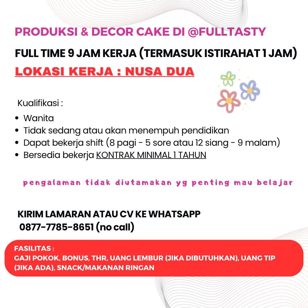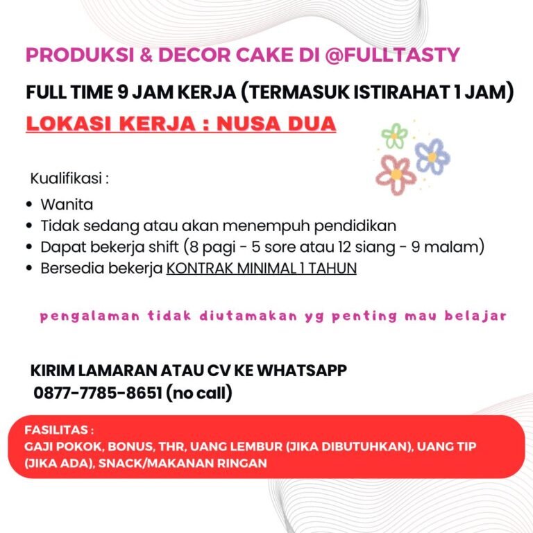 LOKER.BALINEWS.ID, BADUNG – Kabar gembira bagi pencari kerja di sektor kuliner, khususnya yang berdomisili di wilayah Badung Selatan. @Fulltasty saat ini sedang membuka kesempatan berkarir untuk posisi Staff Produksi & Decor Cake yang akan ditempatkan di cabang Nusa Dua. Posisi ini terbuka bagi pelamar wanita yang memiliki semangat belajar tinggi, di mana pengalaman kerja sebelumnya tidak diutamakan asalkan memiliki kemauan kuat untuk berkembang.