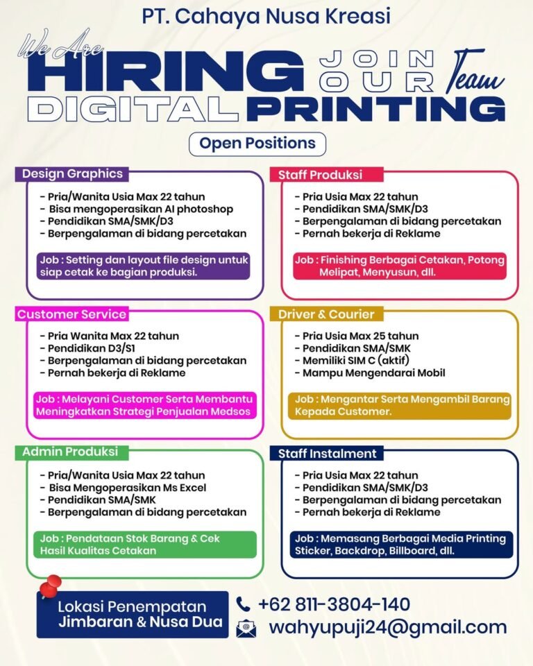 LOKER.BALINEWS.ID, BADUNG – PT. Cahaya Nusa Kreasi membuka kesempatan kerja untuk Anda yang bersemangat bergabung di industri percetakan digital. Saat ini tersedia beberapa posisi, antara lain Design Graphics, Customer Service, Admin Produksi, Staff Produksi, Driver & Courier, serta Staff Instalment dengan penempatan di wilayah Jimbaran dan Nusa Dua.