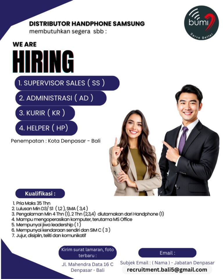 LOKER.BALINEWS.ID, DENPASAR — Distributor handphone Samsung membuka lowongan untuk beberapa posisi: Supervisor Sales (SS), Administrasi (AD), Kurir (KR), dan Helper (HP).