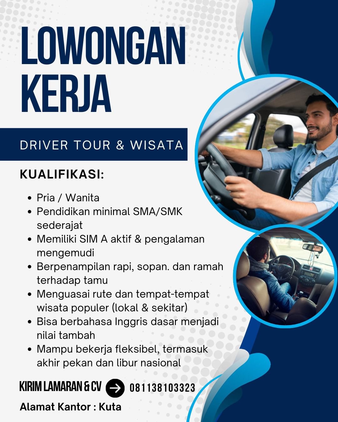 LOKER.BALINEWS.ID, BADUNG — Telah dibuka Lowongan Kerja Bali Driver Tour dan Wisata untuk penempatan wilayah Kuta. Perusahaan pariwisata lokal membutuhkan kandidat yang berpenampilan rapi, ramah kepada tamu, serta memahami rute dan lokasi wisata populer di Bali dan sekitarnya. Pelamar wajib memiliki SIM A aktif, pengalaman mengemudi, dan siap bekerja secara fleksibel termasuk pada akhir pekan maupun hari libur nasional.