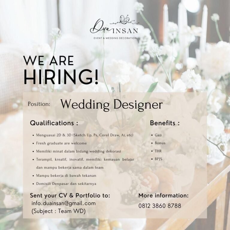 LOKER.BALINEWS.ID, DENPASAR – Industri kreatif di bidang dekorasi pernikahan kini kembali membuka peluang emas bagi para talenta muda di Bali. Dua Insan Event & Wedding Decoration secara resmi mengumumkan pembukaan lowongan kerja untuk posisi Wedding Designer. Langkah rekrutmen ini dilakukan guna menghadirkan konsep-konsep dekorasi yang lebih segar dan elegan bagi para klien yang ingin mewujudkan pernikahan impian mereka di Pulau Dewata.