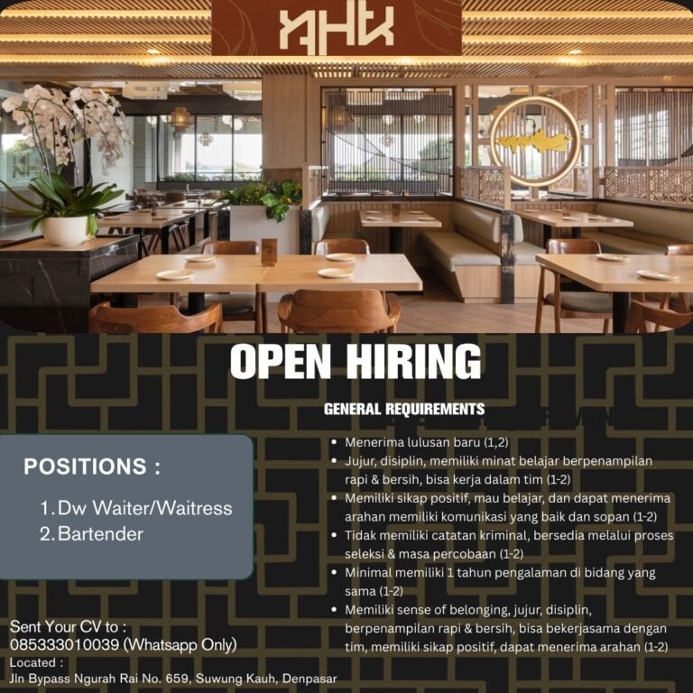 LOKER.BALINEWS.ID, DENPASAR – Sebuah unit usaha kuliner yang berlokasi strategis di Jalan Bypass Ngurah Rai No. 659, Suwung Kauh, Denpasar, saat ini sedang membuka kesempatan karier bagi para pencari kerja lokal. Perusahaan tengah mencari kandidat yang energik dan profesional untuk mengisi posisi sebagai Daily Worker (DW) Waiter/Waitress serta Bartender. Kesempatan ini terbuka bagi mereka yang memiliki semangat kerja tinggi dan ingin bergabung dalam lingkungan kerja yang dinamis.