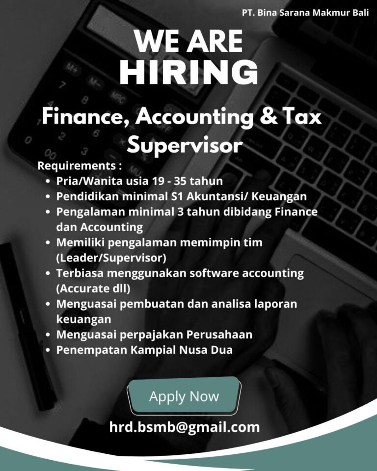 Lowongan Kerja Bali Finance, Accounting & Tax Supervisor di PT. Bina Sarana Makmur Bali