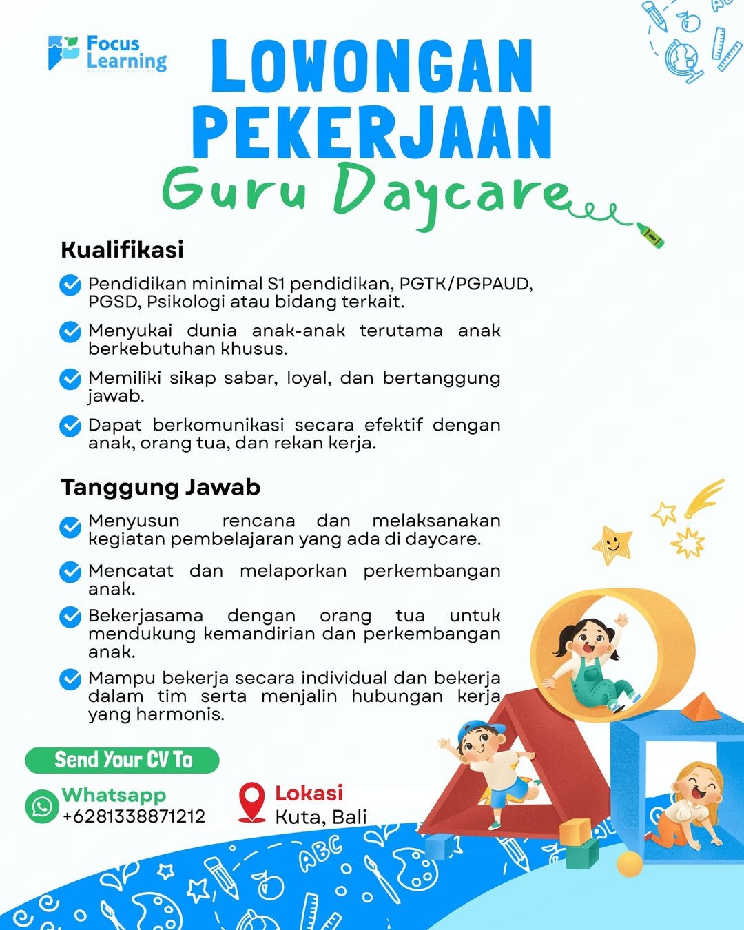 LOKER.BALINEWS.ID, BADUNG – Focus Learning, lembaga pendidikan yang berdedikasi pada tumbuh kembang anak, saat ini membuka kesempatan karir bagi para profesional di bidang edukasi untuk mengisi posisi sebagai Guru Daycare. Lowongan ini diperuntukkan bagi individu yang memiliki kepedulian tinggi terhadap dunia anak-anak, khususnya dalam lingkungan pengasuhan dan pembelajaran harian.