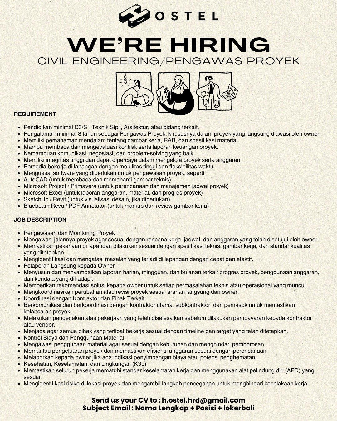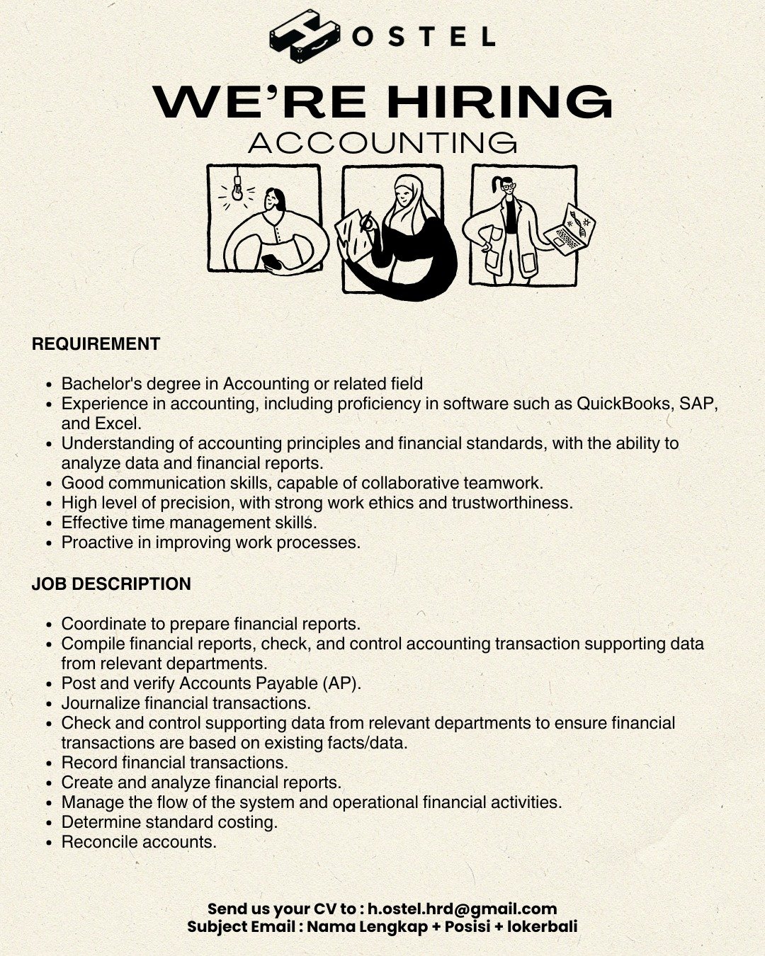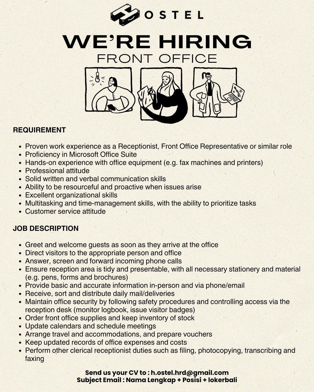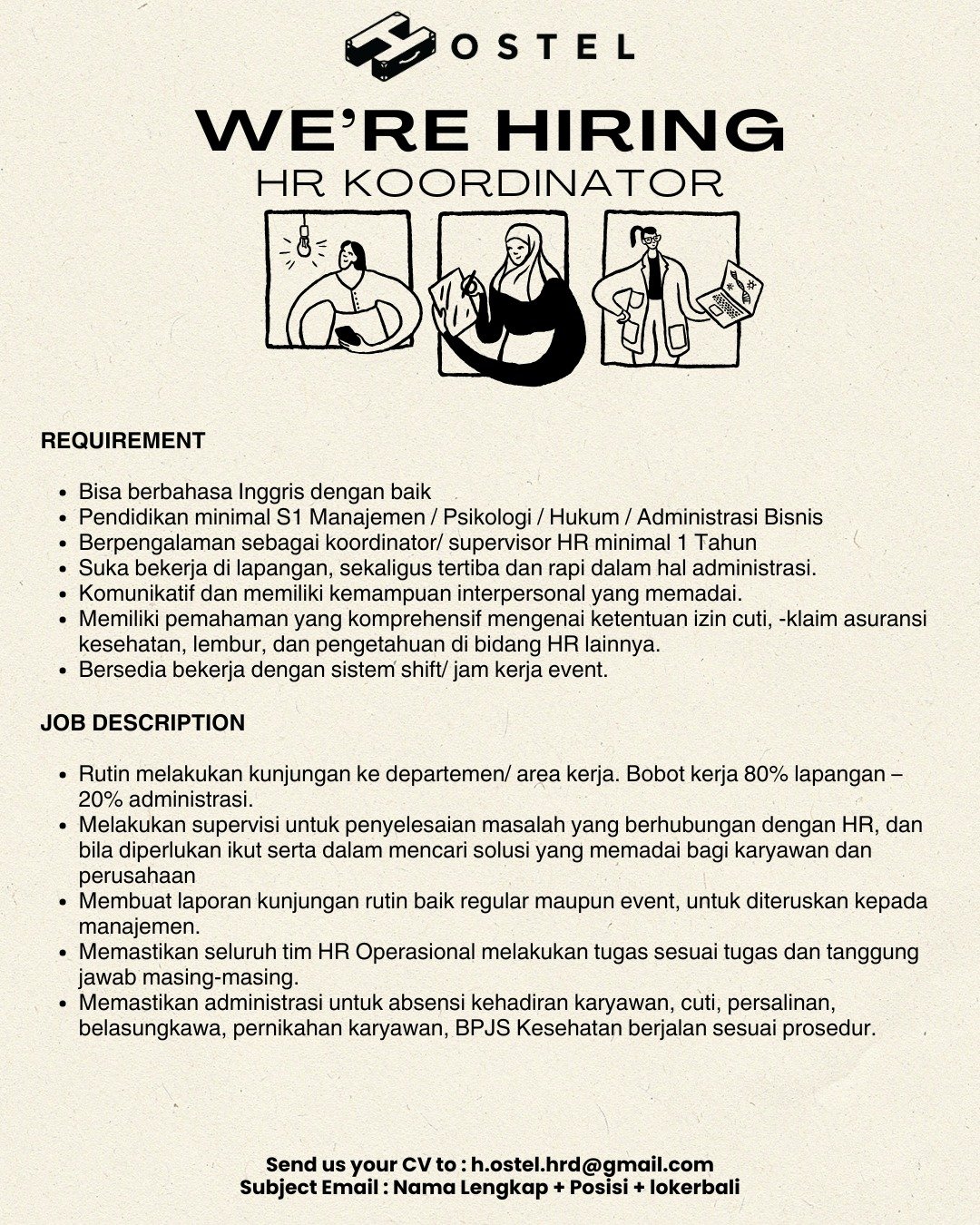 Pelamar dapat mengirimkan CV ke h.ostel.hrd@gmail.com dengan format subjek: Nama Lengkap + Posisi + lokerbali. Rekrutmen akan berlangsung hingga seluruh posisi terpenuhi.