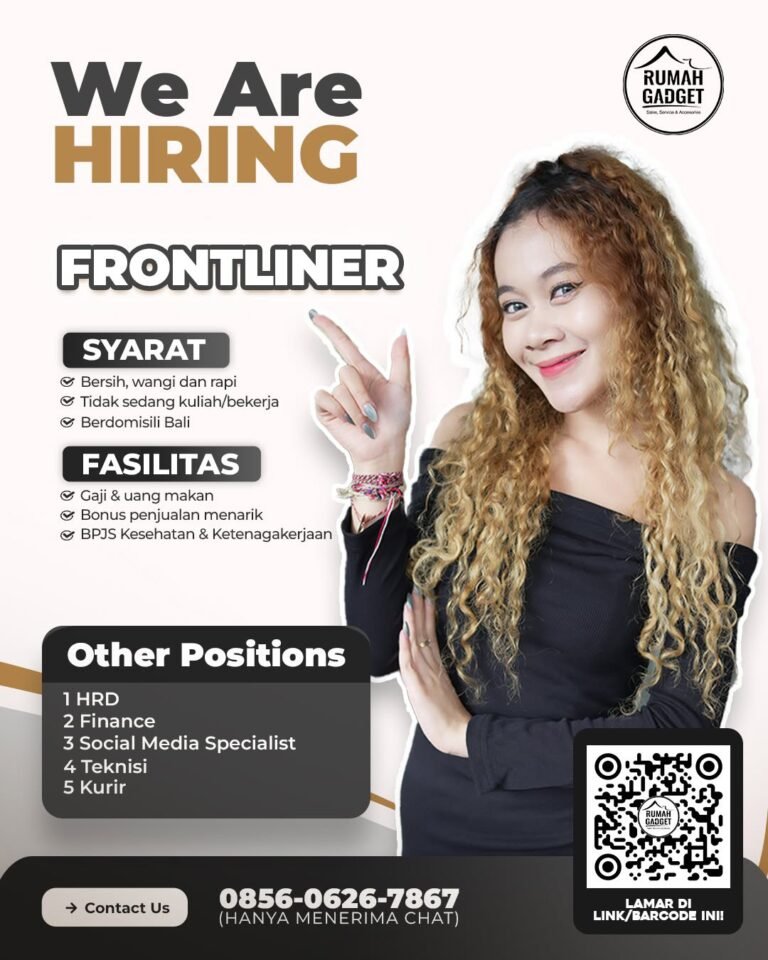 LOKER.BALINEWS.ID, BALI – Rumah Gadget, salah satu pusat penjualan dan servis perangkat elektronik ternama di Bali, sedang membuka kesempatan karir besar-besaran bagi masyarakat lokal. Saat ini, posisi utama yang dibutuhkan adalah Frontliner, namun perusahaan juga membuka lowongan untuk lima posisi strategis lainnya yakni HRD, Finance, Social Media Specialist, Teknisi, dan Kurir guna mendukung operasional bisnis yang terus berkembang.