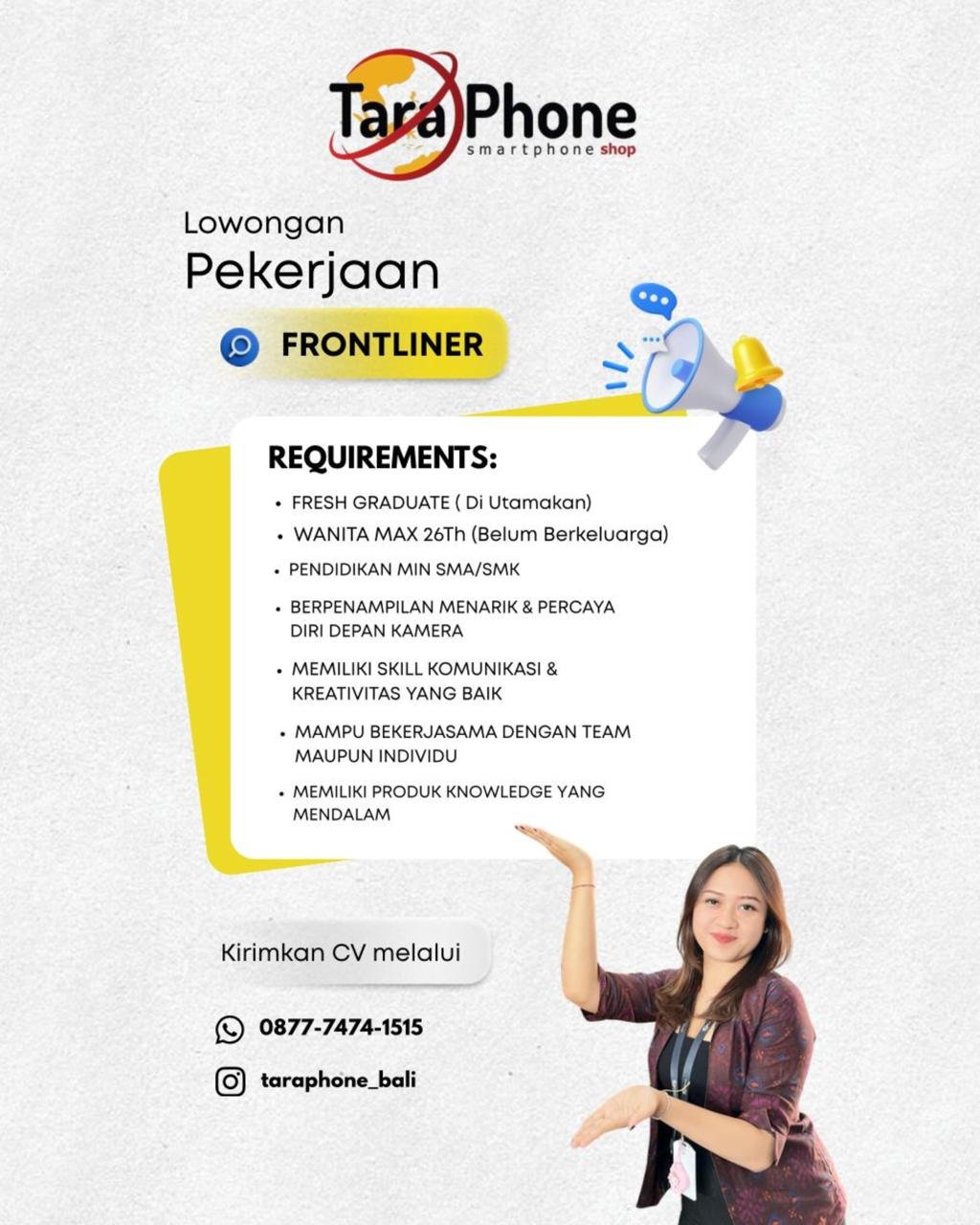 LOKER.BALINEWS.ID, DENPASAR — TaraPhone Smartphone Shop membuka lowongan untuk posisi Frontliner.